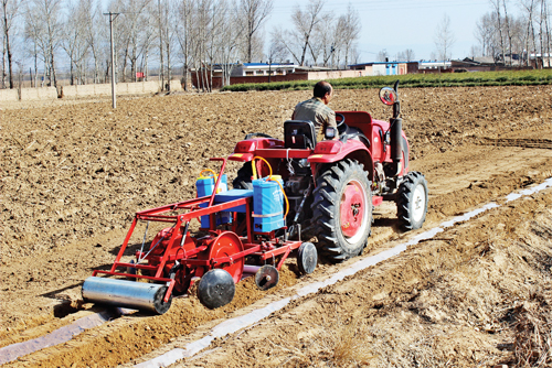 4月6日,原平市蘇龍口鎮(zhèn)計明農(nóng)機合作社農(nóng)民正在用集水鋪膜精播機播種旱地玉米。由原平四維農(nóng)機公司制造的集水鋪膜精播機可種植旱地玉米、高粱、谷子等多種農(nóng)作物,鋪膜下種一次完成,由于所鋪地膜中間形成凹槽,有利于收集雨水滲入禾苗根部,大大提高了旱地作物抗旱能力,受到山區(qū)農(nóng)民歡迎。(曹申義 攝)