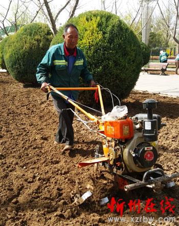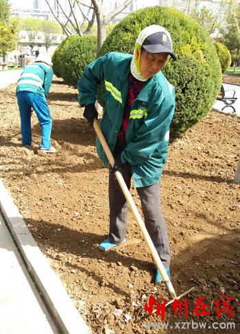 春暖花開,4月13日,忻州市人民公園的園林養(yǎng)護人員忙著翻地、施肥,為不同花期的育苗做準備。忻州市人民公園是我市城市文明的一大場所,為全方位提升人均環(huán)境質(zhì)量和城市競爭力,給廣大市民創(chuàng)造一個文明、衛(wèi)生、安全、和諧的休閑游樂環(huán)境,園林養(yǎng)護人員一年四季不斷地為公園綠化服務(wù),確保公園內(nèi)的花、草、樹都能如期開花、結(jié)果。(李濤 攝)