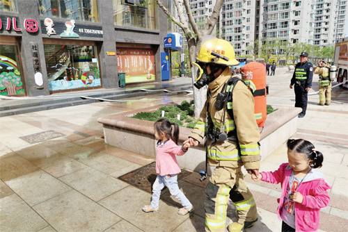 圖為消防員護(hù)送小朋友離開(kāi)救援現(xiàn)場(chǎng)