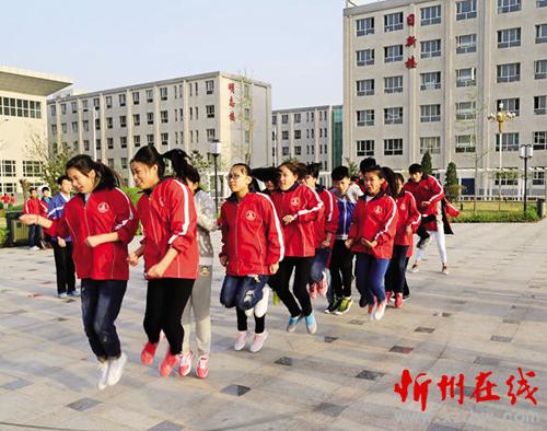 為紀(jì)念“ 五四”運(yùn)動(dòng)97 周年, 豐富學(xué)生課余文化生活, 忻州三中于4 月15 日到18 日舉行了集體跳繩比賽活動(dòng)。22個(gè)參賽隊(duì)、400多名運(yùn)動(dòng)員參加了比賽。圖為比賽現(xiàn)場(chǎng)。(焦秀峰 攝)