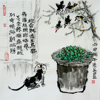 忻州知名節(jié)目主持人“二黃毛”看到這幅漫畫后,詩興大發(fā):“粽香飄遠(yuǎn)玉鳥歡,飛落枝頭欲啄殘;怎奈饞貓虎視眈,別有情趣戲端陽?!睆埼挠X得老同學(xué)“二黃毛”的詩詮釋了畫意,于是將四句詩題寫于畫上,詩與畫頓時(shí)渾然天成。