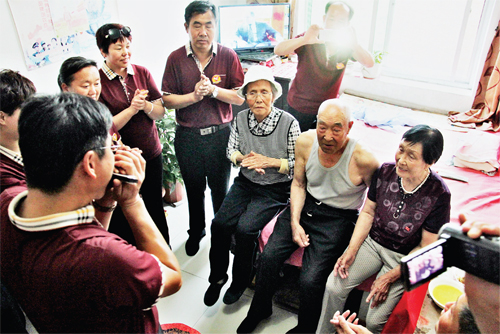 7月2日,原平市新原鄉(xiāng)集中供養(yǎng)敬老院里歌聲飛揚,原平佳藝藝術團和口琴聯(lián)盟會給這里的老人們送上了一道文化大餐。原平市加強養(yǎng)老服務,在各鄉(xiāng)鎮(zhèn)建設養(yǎng)老院,使老年人老有所依、老有所養(yǎng),社會團體和群眾藝術團經(jīng)常送文化、送藝術到養(yǎng)老院,豐富了老人們的文化生活。圖為志愿者為老人獻唱。(吉建平 攝)
