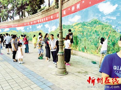 活動(dòng)現(xiàn)場(chǎng),廣場(chǎng)的弧形墻壁上一幅長(zhǎng)45.5米、高2.9米的巨幅沙漠圖景栩栩如生,以筆為媒,你一筆,我一筆,你我都來(lái)畫(huà)一筆,市民用畫(huà)筆“種樹(shù)”,使“荒漠”變?yōu)椤熬G洲”,變?yōu)樯帧;顒?dòng)從上午9點(diǎn)一直持續(xù)到晚上9點(diǎn),市民們爭(zhēng)相前來(lái)完成森林圖景,讓和平廣場(chǎng)增添一份不一樣的美麗。來(lái)自我市長(zhǎng)征路小學(xué)10歲的高藝軒,學(xué)習(xí)繪畫(huà)已有三年時(shí)間。他說(shuō)這樣的活動(dòng)讓他和小伙伴們開(kāi)闊了視野,更加熱愛(ài)自然、熱愛(ài)綠色了。