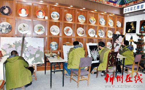 推光漆器是代縣傳統(tǒng)手工藝品,以其古樸典雅、獨具特色、充滿雁門風情而走俏市場。推光漆器的制作過程頗為繁雜,要經過制胚、披麻、刮泥、油漆、推光、彩畫、罩漆、銅工等八道工序,尤其是推光彩畫部分,用色濃麗飽滿、鮮艷奪目。圖為代縣華亭環(huán)藝雕塑有限公司的工匠們正在創(chuàng)作推光漆器。(石俊文 攝)