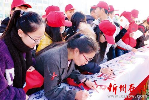 12月1日,在第29個(gè)“世界艾滋病日”到來(lái)之際,我市在忻州體育廣場(chǎng)啟動(dòng)了主題為“攜手抗艾,重在預(yù)防”的艾滋病防治宣傳活動(dòng)?;顒?dòng)現(xiàn)場(chǎng),來(lái)自市疾控中心、健康教育所等單位的工作人員以及忻州師院的志愿者們通過(guò)展板、宣傳欄、發(fā)放資料的形式向市民講解了艾滋病傳播途徑、艾滋病流行現(xiàn)狀與危害、如何預(yù)防艾滋病等方面的知識(shí)。工作人員現(xiàn)場(chǎng)為市民答疑解惑,呼吁廣大市民用科學(xué)、理性的態(tài)度正確認(rèn)識(shí)艾滋病,不歧視艾滋病病毒感染者。圖為志愿者在條幅上簽名(實(shí)習(xí)記者 王菲 王君 攝影報(bào)道)