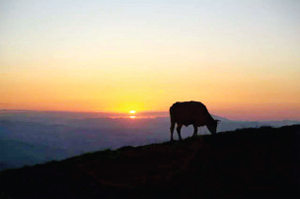 南臺也被稱為花臺,各種野花競相開放,清新雅致。遠(yuǎn)眺峰巒疊嶂,漸入云端,近觀,地上完全鋪上了綠毯,牛馬自在地曬著太陽吃著美味肥草。南臺景色優(yōu)美,但師傅們很清苦,夏天也身穿棉袍,因?yàn)樗聫R里比較陰冷。山上缺水,終年靠接雨水喝為生。我們坐著朋友的紅色越野車下山,擺出各種pose,留下了與綠地、藍(lán)天、白云、奶牛在一起的絕美畫面。