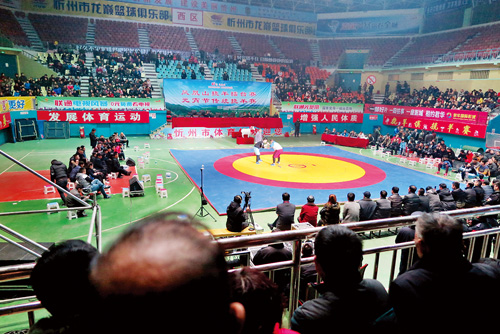 農歷正月十四、十五晚上,鳳凰山撓羊擂臺賽、元宵節(jié)傳統(tǒng)撓羊賽在忻州市體育館舉行,緊張激烈的比賽為我市摔跤愛好者和市民群眾獻上一道濃郁的傳統(tǒng)體育文化盛宴。圖為大賽現(xiàn)場 魯明強 攝