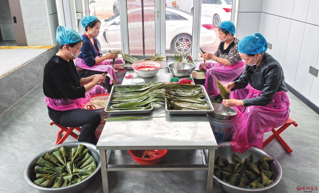 端午節(jié)臨近,粽子迎來銷售旺季。定襄縣的寶宗生態(tài)農(nóng)業(yè)科技有限公司全力投入粽子的生產(chǎn)加工。工作人員圍在桌子旁包粽子,先是理粽葉、挽漏斗、填糯米、配餡料,再壓緊實、封好口、扎定型,之后上鍋蒸煮。(張錦娟 攝)