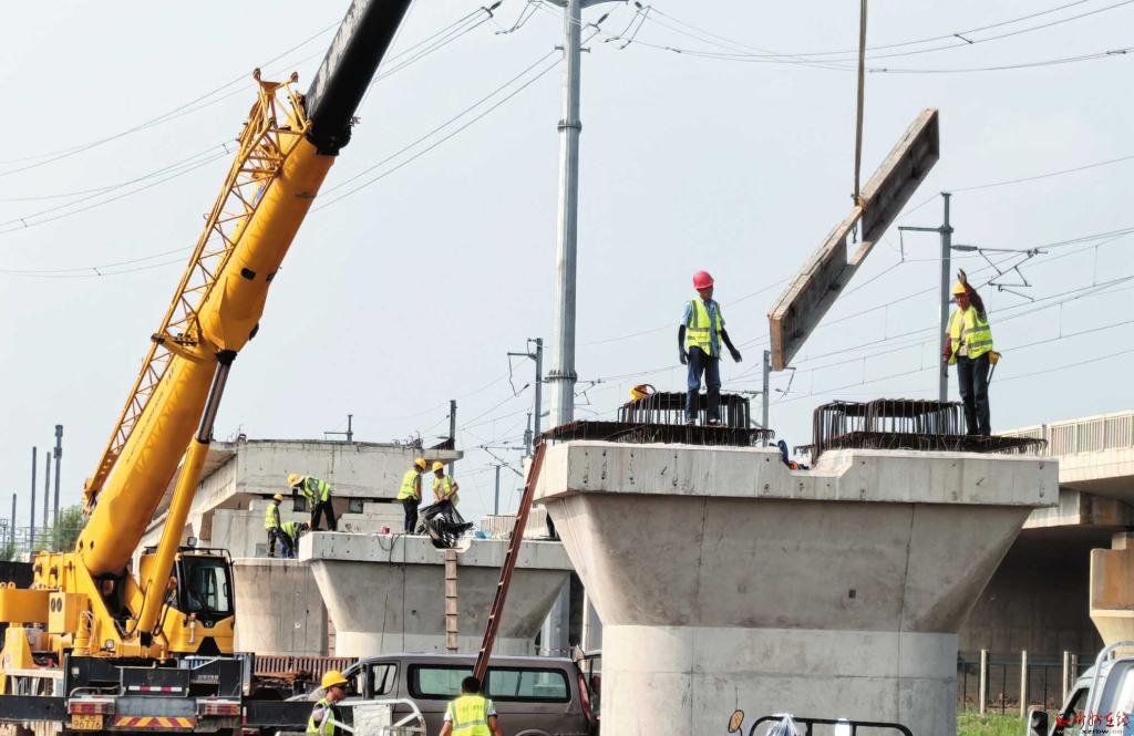 7月23日,在忻府區(qū)小奇村北,由中國鐵建第十七工程局承建的雄忻高鐵高架橋正在緊張施工中。雄忻高鐵在我市境內(nèi)總長115公里,預計2027年建成通車,將成為忻州聯(lián)通京津冀的戰(zhàn)略通道。 (記者 劉紀森攝)