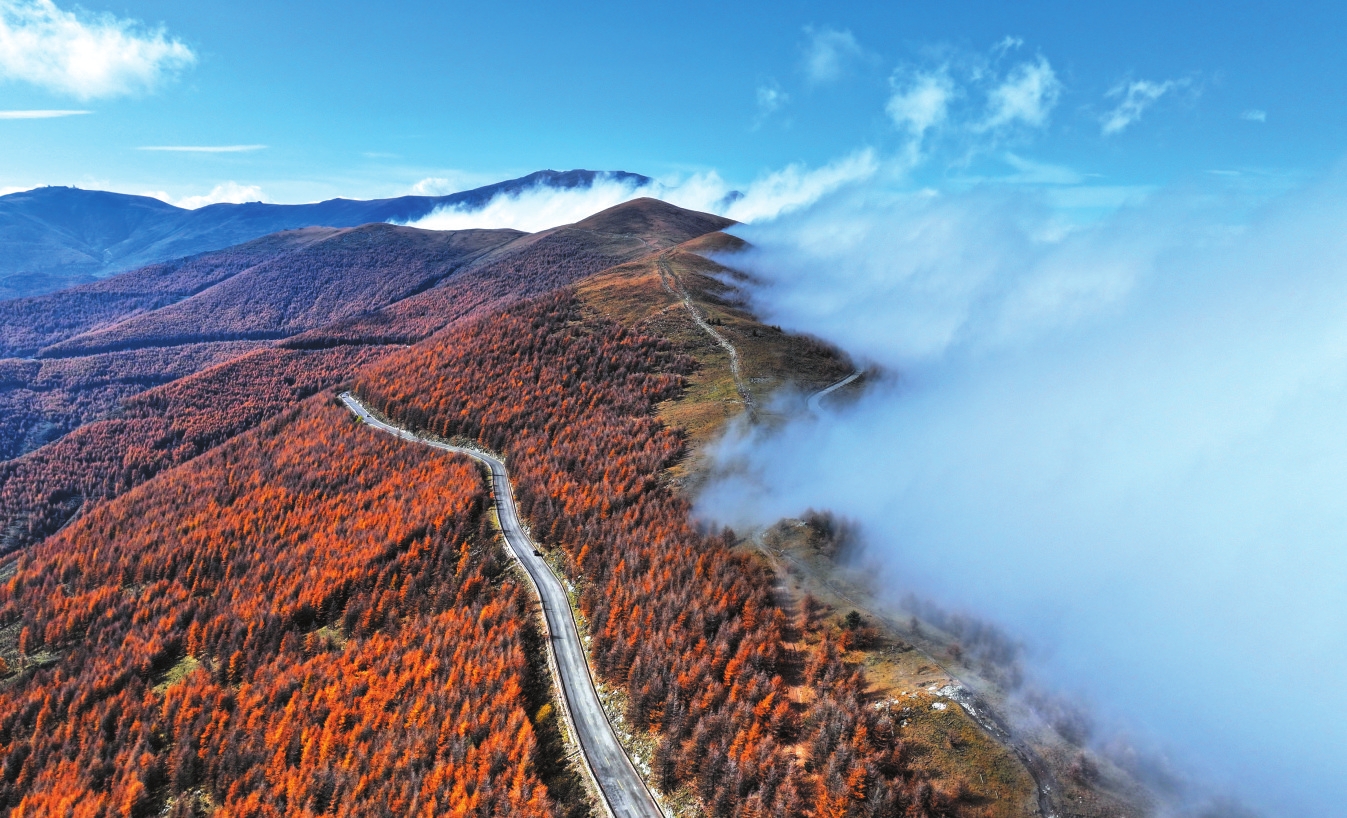 沿盤(pán)山路驅(qū)車(chē)而上,兩側(cè)的華北落葉松與云杉率先奏響秋之序曲。陽(yáng)光穿透枝葉,將針葉染成琥珀色;山風(fēng)過(guò)處,整片林海翻涌著金色波浪。腳下厚厚的落葉層踩上去沙沙作響,散發(fā)著松針與腐殖土混合的清香。在黛螺頂觀景臺(tái),常有云海自山谷間升騰,將五彩斑斕的山林切割成流動(dòng)的色塊,宛如印象派大師筆下的油畫(huà)。