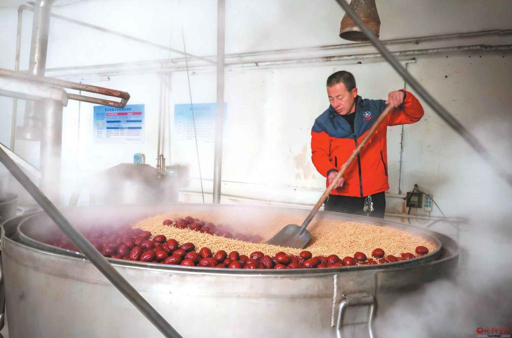 近年來,保德縣貢棗酒開發(fā)基地以“保德油棗”與枸杞入酒,不僅更好地保留了果實的溫補特性,也釀出了獨特的地方風味。該基地不僅是當?shù)赝苿蛹t棗產(chǎn)業(yè)深加工、提升附加值的關(guān)鍵項目,也是將地理標志農(nóng)產(chǎn)品轉(zhuǎn)化為特色商品、助力鄉(xiāng)村振興的生動實踐。圖為保德縣貢棗酒基地,工人在蒸餾車間翻動攪拌麥殼與紅棗等原料,車間內(nèi)蒸汽彌漫。(記者 范琛攝)