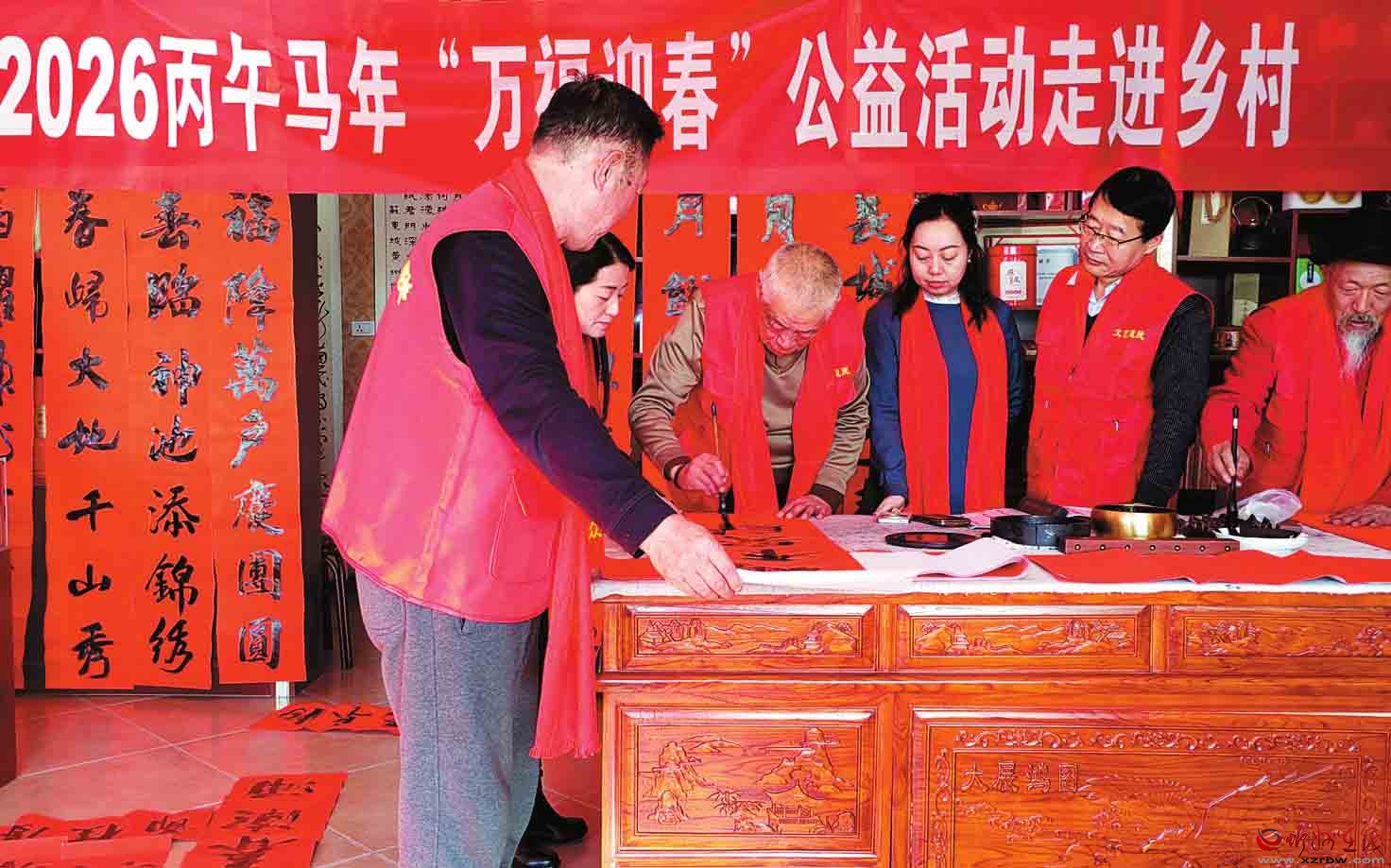 神池縣文聯(lián)、縣書法家協(xié)會(huì)積極響應(yīng)省市“萬福迎春走進(jìn)鄉(xiāng)村”公益活動(dòng)號(hào)召,發(fā)動(dòng)本地文學(xué)愛好者創(chuàng)作兼具地域風(fēng)情與年俗韻味的原創(chuàng)春聯(lián),近日,兩單位聯(lián)合組織書法愛好者深入鄉(xiāng)村,為村民義務(wù)書寫春聯(lián)?;顒?dòng)現(xiàn)場(chǎng)墨香四溢,一幅幅帶著鄉(xiāng)土溫度的春聯(lián)紅遍村頭巷尾,暖心舉措深受群眾交口稱贊。(楊晉明攝)