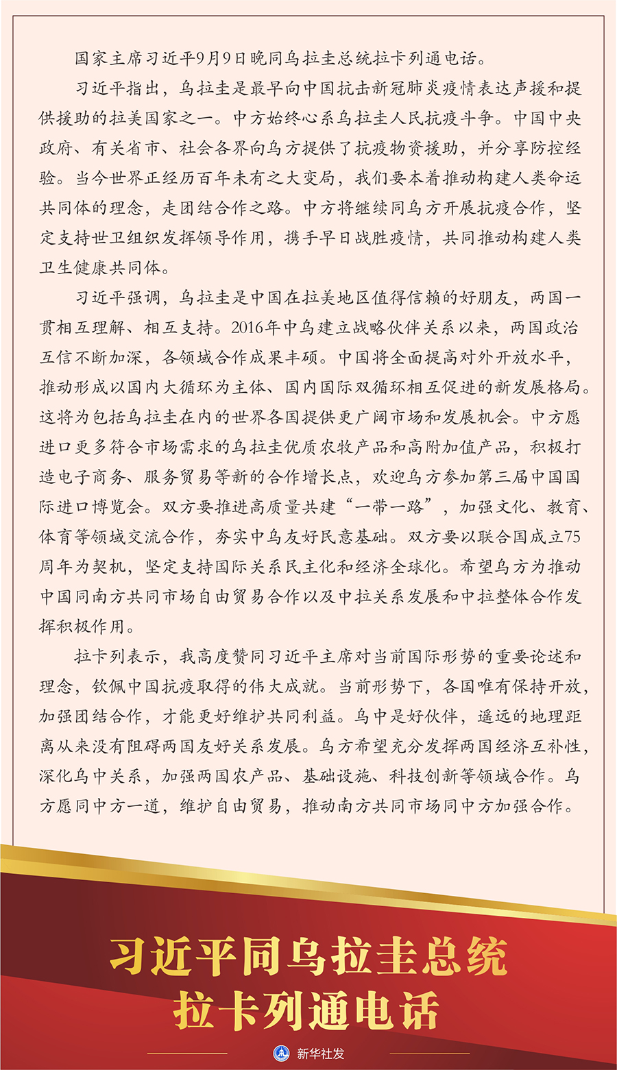 新華社北京9月9日電 國(guó)家主席習(xí)近平9月9日晚同烏拉圭總統(tǒng)拉卡列通電話(huà)。