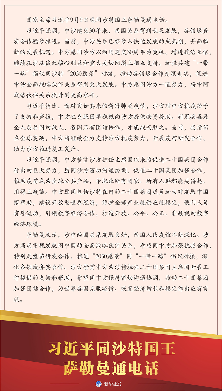 新華社北京9月9日電 國(guó)家主席習(xí)近平9月9日晚同沙特國(guó)王薩勒曼通電話。