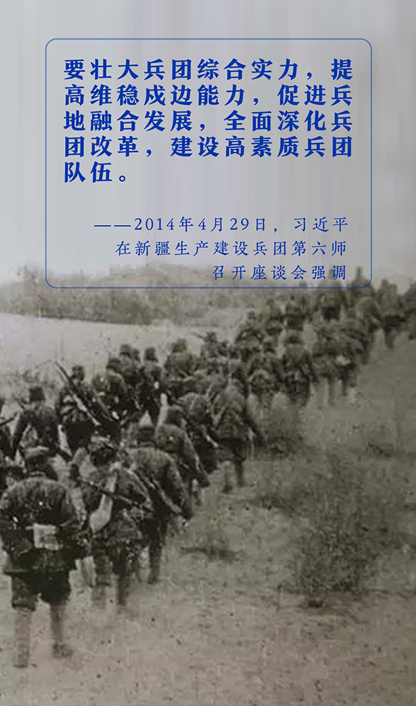 一代代各族兒女發(fā)揚(yáng)胡楊精神、兵團(tuán)精神,無(wú)畏艱險(xiǎn)、勇往直前、甘于奉獻(xiàn),奮力為建設(shè)一個(gè)團(tuán)結(jié)和諧、繁榮富裕、文明進(jìn)步、安居樂業(yè)的中國(guó)特色社會(huì)主義新疆作出貢獻(xiàn)。