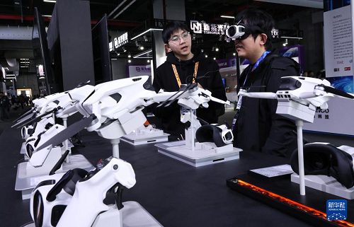3月12日,參觀者(右)在東方樞紐展區(qū)現(xiàn)場(chǎng)佩戴智能眼罩體驗(yàn)全景飛行器視角。(新華社記者 方喆 攝)