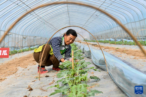 3月18日,山西省運(yùn)城市夏縣夏樂精品瓜業(yè)合作社的工作人員在管護(hù)西瓜苗。(新華社記者 曹陽(yáng) 攝)