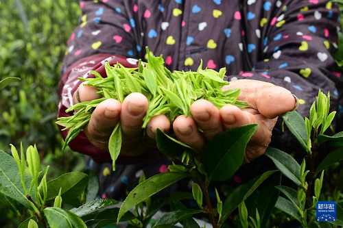 3月28日,在廣西河池市羅城仫佬族自治縣兼愛(ài)鄉(xiāng)大竹村白茶基地,采茶工展示采摘的明前茶芽。(新華社發(fā) 廖光福 攝)