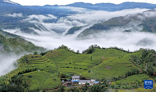 4月12日拍攝的浙江省臺州市仙居縣橫溪鎮(zhèn)陽峰山生態(tài)茶園(無人機(jī)照片)。(新華社發(fā) 王華斌 攝)