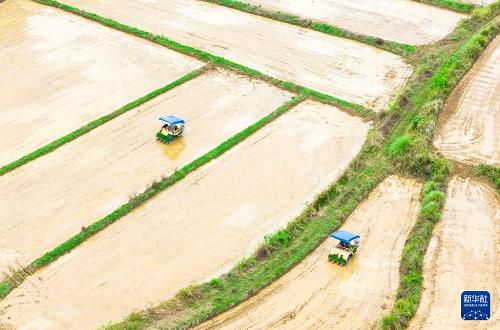 4月11日,湖南省衡陽(yáng)市祁東縣金橋鎮(zhèn)村民駕駛插秧機(jī)進(jìn)行早稻插秧工作。(新華社發(fā) 曹正平 攝)