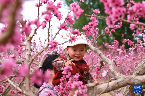 4月12日,游人在甘肅省敦煌市七里鎮(zhèn)桃產(chǎn)業(yè)示范基地游玩。(新華社發(fā) 張曉亮 攝)