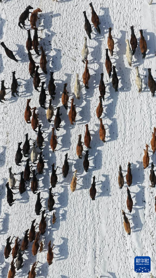 4月14日,山丹馬場(chǎng)的牧馬人組織馬群轉(zhuǎn)場(chǎng)(無(wú)人機(jī)照片)。(新華社發(fā) 王超 攝)