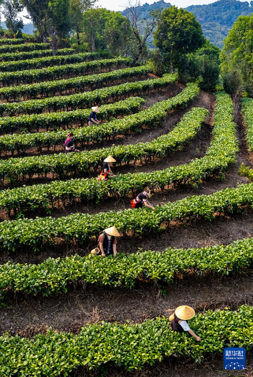 4月15日,茶農(nóng)在普洱市思茅區(qū)倚象鎮(zhèn)的茶山采摘春茶(無(wú)人機(jī)照片)。(新華社記者 陳欣波 攝)
