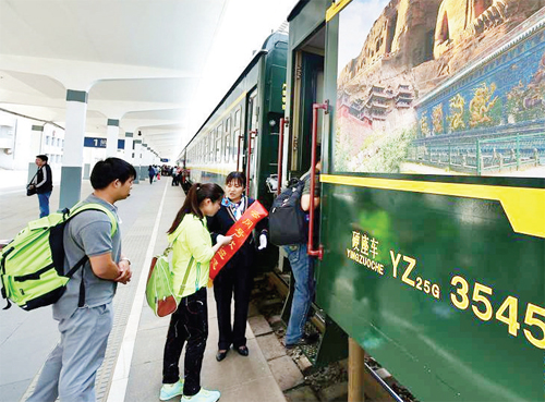 5月27日,旅客在大同火車站檢票登上Y665次列車。當日,山西省首趟“Y”(游)字頭城際旅游專列Y665次列車從大同火車站駛出,開往太原,兩座城市間的旅行時間縮短至3小時以內(nèi)。這輛被命名為“云岡號”的一站直達列車由6節(jié)硬座車、1節(jié)硬臥車、1節(jié)軟臥車組成,每逢周五、六、日發(fā)車,運行時長較目前兩地開行的最快列車還要節(jié)省近50分鐘。(來源:黃河新聞網(wǎng))