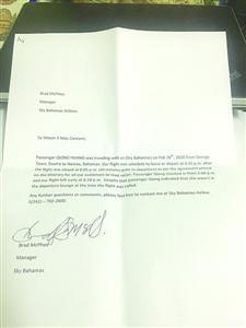SkyBahamas航空公司給黃小姐開(kāi)了一張情況說(shuō)明,稱飛機(jī)確實(shí)早于18點(diǎn)45分起飛。