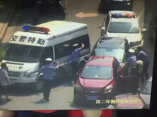 澎湃新聞從長沙市公安局交警部門了解到,事發(fā)12日下午1時許,當民警對一臺由南往北行駛湘A27K07的黑色尼桑小型越野車進行檢查時,該駕駛?cè)司懿幌ɑ?,并緊閉車門、車窗,拒絕出示相關(guān)證件和下車配合接受酒精測試。約20分鐘后,駕駛?cè)送蝗粏榆囕v強行沖關(guān),撞開民警、警車和周邊車輛后逃逸,造成1名民警(韌帶挫傷)、2名群眾受傷(皮外傷),1輛警車(刮擦)、9輛群眾車輛受損。