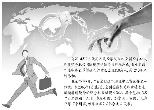 據(jù)了解,截至今年7月,“百名紅通”逃犯中已有三分之一歸案。僅2016年1月至9月,全國檢察機關即勸返遣返、緝捕潛逃境外的職務犯罪嫌疑人34人,其中包括裴健強、陳祎娟、付耀波、周世勤等13名“百名紅通”人員,涉及美國、加拿大、英國、幾內(nèi)亞等17個國家,涉案金額2.6億余元人民幣。