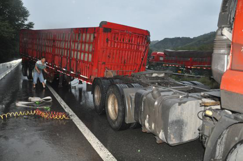 2017年08月26日19時00分許,高速二支隊九大隊民警翟躍、郭騏源接到報警稱:在五保高速8km處,有一輛紅色東風(fēng)牌重型半掛貨車因出車前未檢查車輛,駕駛存在安全隱患的車輛上路行駛,將掛車脫落,后與中央護欄發(fā)生碰撞,造成車輛及路產(chǎn)不同程度損壞的道路交通事故。大隊民警第一時間趕赴現(xiàn)場,只有超車道可以通行,在做好安全防護的情況下,及時詢問當(dāng)事人是否受傷,是否需要撥打“120”急救,并了解了當(dāng)時的事發(fā)情況。當(dāng)事人稱:“自己一個人開車去陜西拉煤,走的時候著急,沒檢查車輛,在行駛過程中,就感覺車輛掛車在擺動,因為是雨天,也沒在意,行駛到8km處時,踩剎車過急,加之路面濕滑,掛車突然脫落與中央護欄發(fā)生碰撞,所幸人沒有受傷?!敝?,民警對現(xiàn)場進行勘查,并調(diào)取監(jiān)控視頻,發(fā)現(xiàn)車輛在剎車時,車速較快,駕駛員駕駛存在安全隱患的車輛是造成事故發(fā)生的原因。