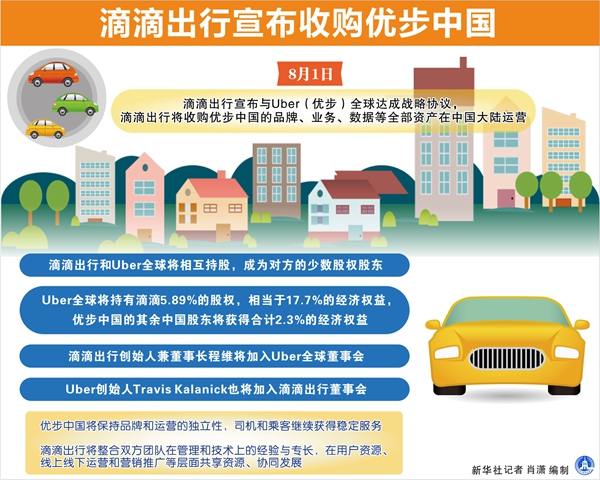 1日,滴滴出行宣布與Uber全球達(dá)成戰(zhàn)略協(xié)議,滴滴出行將收購優(yōu)步中國的品牌、業(yè)務(wù)、數(shù)據(jù)等全部資產(chǎn),在中國大陸運(yùn)營。