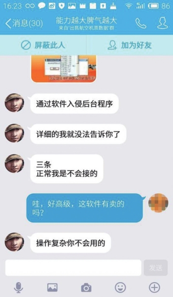 記者以求購(gòu)機(jī)票信息為名在網(wǎng)上找到了十幾名以此為業(yè)的QQ用戶。其中,用戶名為“能力越大脾氣越大”的用戶告訴記者,每條航空機(jī)票信息售價(jià)18元,可以挑選特定的航空公司,買(mǎi)多了,價(jià)格還可以?xún)?yōu)惠。他告訴記者,自己是通過(guò)軟件入侵后臺(tái)程序“調(diào)取”機(jī)票信息,而且都是客戶有需求的時(shí)候才去“調(diào)取”,保證信息新鮮有效。