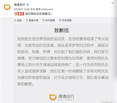 8月29日晚間,滴滴發(fā)出道歉信稱,“官方微博、官方微信的文章未經(jīng)劉翔同意,使用劉翔賽場(chǎng)上照片用于滴滴品牌宣傳推廣,這一行為給劉翔本人造成諸多誤解,在第一時(shí)間刪除了含有劉翔先生肖像的所有侵權(quán)鏈接,對(duì)于此次侵權(quán)行為,我們表示最誠(chéng)摯的歉意?!?/p>