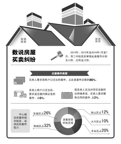 據(jù)通報,2014年、2015年及2016年1月至7月,市二中院先后審理涉及戶口遷移問題的房屋買賣合同糾紛案件分別為13件、22件及15件。其中,買房人要求現(xiàn)有戶口遷出的案件占此類案件總數(shù)的86%。該類案件中,有一半涉及了案外人的戶口,除了賣房人的戶口外,戶口上還有他的親戚、甚至是這套房子更早以前的房主。