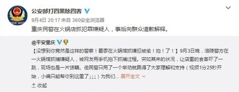 事后,有媒體了解到這名道歉者是來(lái)自重慶市涪陵區(qū)公安局荔枝派出所的一名民警。據(jù)他介紹,當(dāng)時(shí)是正在對(duì)一名長(zhǎng)期吸販毒的犯罪嫌疑人實(shí)施抓捕。由于嫌疑人吸食毒品精神亢奮且隨身攜有刀具,抓捕過(guò)程比較激烈,不少店內(nèi)客人都起身圍觀,有些還拿出手機(jī)拍攝。抓捕結(jié)束后,帶隊(duì)民警第一時(shí)間找來(lái)餐館老板,亮明身份后表示警方會(huì)妥善處理餐館損失,并且特意向店內(nèi)顧客道歉,于是就有了視頻中顯示的畫面。