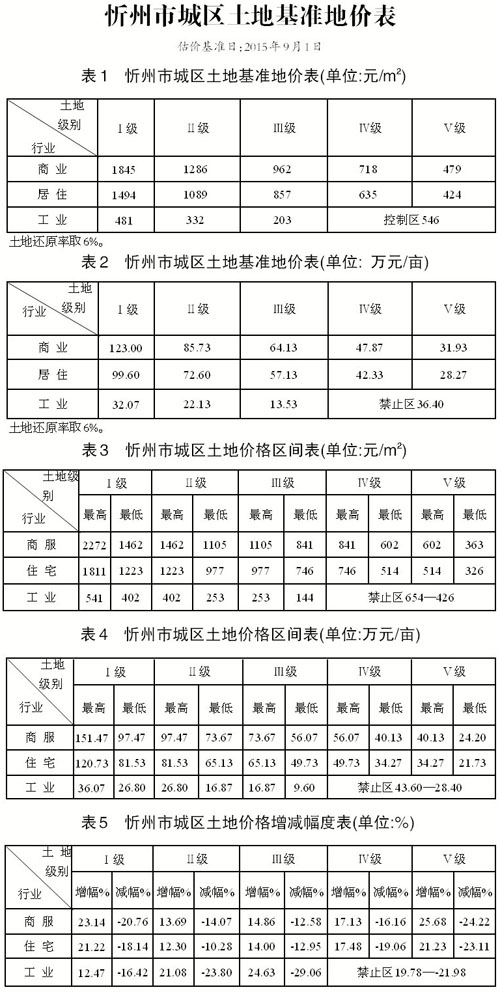 忻州市新一輪城鎮(zhèn)土地面積134.99平方公里基準(zhǔn)地價更新工作已經(jīng)省國土資源廳組織有關(guān)專家檢查驗收。根據(jù)《山西省國土資源廳關(guān)于忻州市城鎮(zhèn)土地定級估價更新結(jié)果的批復(fù)》(晉國土資技審〔2015〕118號),現(xiàn)將忻州市城鎮(zhèn)土地基準(zhǔn)地價予以公布實施。