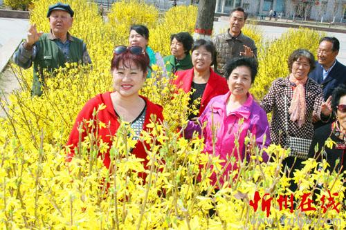 大地回春,萬物吐新,姹紫嫣紅 迎春花開。4月2日,原平市北城社區(qū)的老年人們一起正在金燦燦的迎春花花叢里歡歌笑語,享受著濃濃的春意。他們歌唱新生活放歌而陶醉 。(趙春曉 攝)