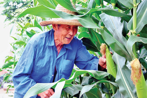 7 月4 日,原平市武彥村老農看著長勢喜人的玉米喜上眉梢:如今惠農政策真是好,調動了俺們的種田積極性,利用科技種的玉米,長得好,結穗早,收入高,看著真開心。(趙春曉 攝)