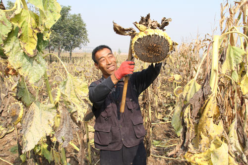 10月13日,原平市解村鄉(xiāng)圪坨村林同種植專業(yè)合作社正在收獲向日葵,該社引進(jìn)三瑞公司種植1000余畝SH363向日葵喜獲豐收。近年來,該市積極引導(dǎo)農(nóng)民調(diào)整農(nóng)業(yè)產(chǎn)業(yè)結(jié)構(gòu),采取“合作社+農(nóng)戶”的模式,向日葵比玉米收入高四倍,銷售價每斤4塊左右,合作社為農(nóng)戶提供種子、種植技術(shù)等服務(wù),帶動當(dāng)?shù)厝罕娫鍪罩赂弧?span style="font-family: 楷體,楷體_gb2312, simkai">圖為解村鄉(xiāng)村民趁著秋高氣爽的晴好天氣,在田間地頭葵花籽的情景。(褚震 攝)