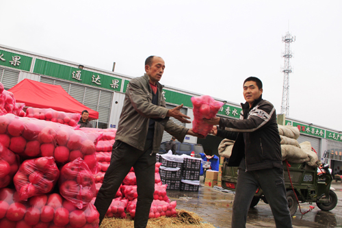 10月23日,原平市果農(nóng)正在德金城農(nóng)產(chǎn)品交易市場卸貨,進行銷售。原平市著力打通農(nóng)產(chǎn)品銷售渠道,通過創(chuàng)建市場、加強管理,將當?shù)剞r(nóng)產(chǎn)品規(guī)范到統(tǒng)一銷售場所,抱團銷售農(nóng)產(chǎn)品,不僅方便了消費者,而且便于走出去,打造知名品牌。(吉建平 攝)