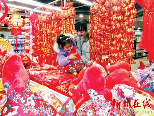 春節(jié)越來越近,我市各地迎新春氣氛越來越濃,市場(chǎng)上吉祥喜慶的商品琳瑯滿目,年味十足。1月10日,原平市一對(duì)母子正在挑選迎春飾品。(趙春曉 攝)
