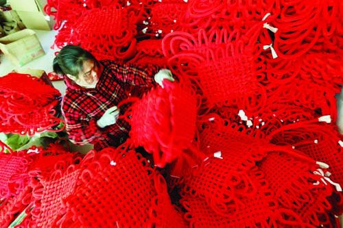 1月11日,在山東省臨沂市郯城縣紅花鎮(zhèn)一家工藝品廠,工人在整理中國(guó)結(jié)。春節(jié)臨近,山東臨沂、棗莊等地的節(jié)慶飾品車間、手工藝人開(kāi)始忙碌起來(lái),人們加緊制作各種春節(jié)飾品,供應(yīng)市場(chǎng)。據(jù)新華社 張春雷 攝