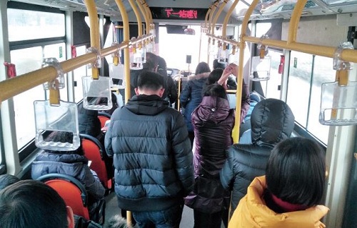 近日,我市發(fā)布重污染天氣橙色預(yù)警,忻州城區(qū)機(jī)動(dòng)車實(shí)行單雙號(hào)限行。限行期間,城市公交車加大運(yùn)營(yíng)力度,為出行市民提供免費(fèi)服務(wù)。圖為1月10日上午,306路公交車上內(nèi)景。魯明強(qiáng) 攝