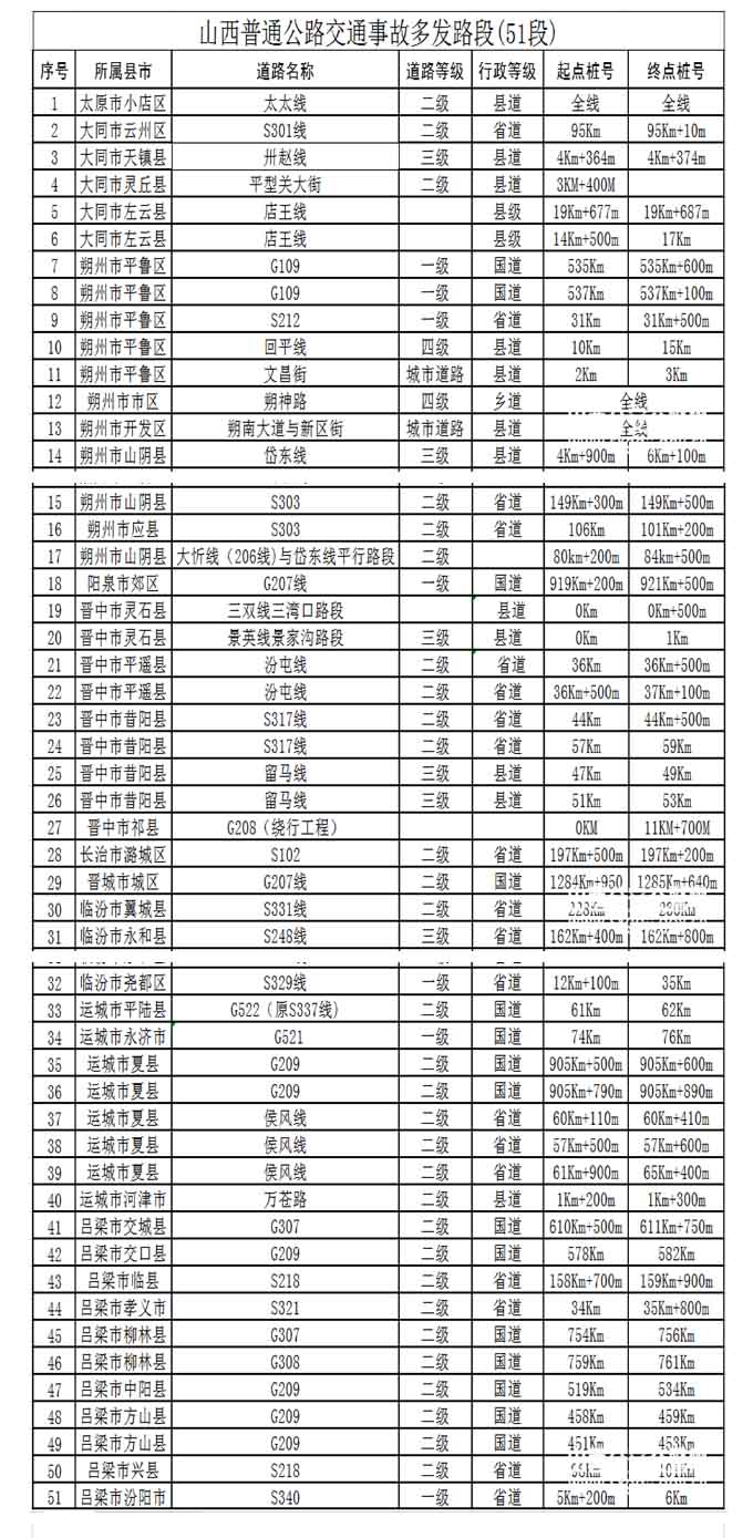 此次公布的68處道路事故多發(fā)點段,其中山西普通公路交通事故多發(fā)路段51段,山西高速公路交通事故多發(fā)路段17段。