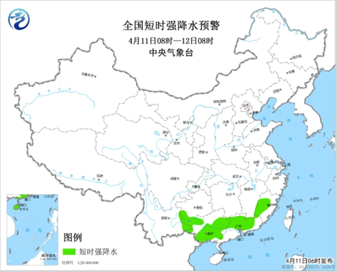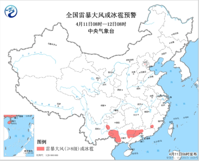 預計4月11日08時至12日08時,貴州西南部、福建西南部、廣西西部和東部、廣東西北部等地的局地將有8-10級雷暴大風或冰雹天氣;此外,貴州西南部、福建西部、廣西大部、廣東中北部等地的部分地區(qū)將有短時強降水天氣,小時雨強20-40毫米,局地可達50毫米以上。