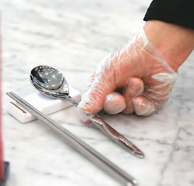 在北京市朝陽大悅城一家餐飲店內(nèi),食客隔位而坐,餐具“公私”分明?!伴_始使用公筷、公勺時,有點不習慣,不過現(xiàn)在已經(jīng)適應(yīng)了,分著吃更安全?!痹诘陜?nèi)用餐的黃先生說。