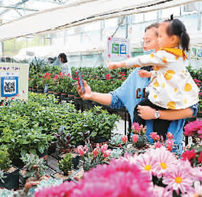 江蘇南通市民在五里樹花卉基地掃碼購買鮮花,體驗不接觸購物帶來的便捷。王俊榮攝(人民視覺)