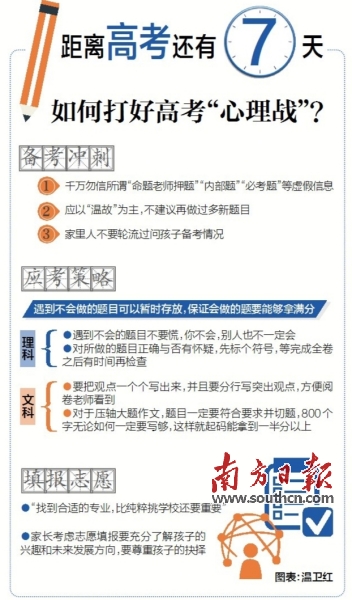 高考進(jìn)入最后倒計(jì)時(shí),沖刺階段如何提分?高考改革后,大學(xué)、中學(xué)、師生等應(yīng)如何應(yīng)對(duì)?27日,華南師范大學(xué)人才測(cè)評(píng)與考試研究所所長(zhǎng)張敏強(qiáng)做客廣東職工大講堂第二十四場(chǎng),講解“高考改革應(yīng)對(duì)策略與高三沖刺應(yīng)對(duì)措施”。 張敏強(qiáng)提醒,沖刺階段切勿盲目相信網(wǎng)上所謂的“內(nèi)部題”“必考題”,應(yīng)以“溫故”為主,不建議再做過(guò)多新題目。他提醒家長(zhǎng),考慮志愿填報(bào)要充分了解孩子的興趣和未來(lái)發(fā)展方向,要尊重孩子的抉擇,“找到合適的專業(yè),比純粹挑學(xué)校還要重要?!?/p> ●南方日?qǐng)?bào)記者 畢嘉琪 黃應(yīng)來(lái) 實(shí)習(xí)生 黃靜儀 通訊員 姚文軍 談改革 用全國(guó)卷對(duì)錄取沒(méi)有影響 高考既是學(xué)生的人生大考,也是對(duì)社會(huì)管理的大考驗(yàn)。張敏強(qiáng)透露,今年全國(guó)高考報(bào)名考生約970萬(wàn)人,“粗略估算,考生的父母、祖輩近7000萬(wàn)人,加上超過(guò)100萬(wàn)的監(jiān)考人員及其他工作人員,與高考相關(guān)的人數(shù)接近一億人?!庇纱?,高考的公平性和科學(xué)性歷來(lái)受到高度關(guān)注。 張敏強(qiáng)梳理了從1977年恢復(fù)高考以來(lái),我國(guó)高考改革的歷程。他提煉了2014年國(guó)家發(fā)布的高考改革方案中的多項(xiàng)重大變化:一是高考不再分文理科;二是西部高校為中西部學(xué)子留專門名額,部屬高校嚴(yán)控屬地招生比例;三是高考加分項(xiàng)目“瘦身”;四是重點(diǎn)高校定向招收貧困生;五是高中學(xué)業(yè)水平考試一年兩考,覆蓋所有科目避免偏科。 而從今年起,高校自主招生已逐步嚴(yán)控規(guī)模,并安排在高考后進(jìn)行;中學(xué)也將逐步建立學(xué)生綜合素質(zhì)檔案,供高校錄取參考。 著眼廣東,今年高考也有一項(xiàng)重大變化——回歸全國(guó)卷?!拔艺J(rèn)為,今年使用全國(guó)卷對(duì)廣東來(lái)說(shuō)是好的。國(guó)家命題,出卷老師和考試大綱是長(zhǎng)期穩(wěn)定的,全國(guó)的師資條件及水平,對(duì)比省級(jí)有優(yōu)勢(shì);而省級(jí)自主命題,受人員及其他條件的影響,科目之間難度起伏比較大,”張敏強(qiáng)說(shuō)。 有不少學(xué)生家長(zhǎng)擔(dān)心,相比廣東卷,今年的全國(guó)卷會(huì)難度增加,甚至?xí)绊戜浫?。張敏?qiáng)回應(yīng)稱,國(guó)家命題與省命題對(duì)錄取沒(méi)有影響,而高考實(shí)際上是“常模參照考試”,錄取按照從高分到低分的順序進(jìn)行?!爸袊?guó)的高考是按省定名額、劃分?jǐn)?shù)線的,所以,無(wú)論是國(guó)考、省考,錄取總額是不變的,錄取關(guān)注的是排名的位置?!?/p> 談?dòng)绊?“3+3”組合將影響專業(yè)錄取 根據(jù)廣東省人民政府頒發(fā)《關(guān)于深化考試招生制度改革的實(shí)施意見(jiàn)》(以下簡(jiǎn)稱“實(shí)施意見(jiàn)”),廣東的考試招生制度單項(xiàng)改革從2016年陸續(xù)展開(kāi),2018年啟動(dòng)高考綜合改革,2021年高考實(shí)行新的高考綜合改革方案。那么,未來(lái)廣東的高考將如何實(shí)施? “我省高考將統(tǒng)一實(shí)行‘3+3’的考試模式?!睆埫魪?qiáng)解析,未來(lái)廣東本科院校招生不分文理科設(shè)置考試科目,實(shí)行語(yǔ)文、數(shù)學(xué)、外語(yǔ)3門統(tǒng)一高考科目和3門高中學(xué)業(yè)水平考試科目考試方式,即“大3+小3”。 其中,外語(yǔ)、學(xué)業(yè)水平考試實(shí)現(xiàn)“一年兩考”;語(yǔ)文、數(shù)學(xué)、外語(yǔ)每科滿分150分。而3門高中學(xué)業(yè)水平考試科目由考生根據(jù)所報(bào)考高校的要求和自身特長(zhǎng),在思想政治、歷史、地理、物理、化學(xué)、生物等科目中自主選擇。 高考方式的改革無(wú)疑給中學(xué)、大學(xué)的教學(xué)管理乃至每個(gè)家庭的抉擇帶來(lái)不小的挑戰(zhàn)。張敏強(qiáng)指出,在“大3+小3”的新高考模式下,思想政治、歷史、地理、物理、化學(xué)、生物6科,學(xué)生選擇3科,所以共有20種組合。學(xué)生和老師會(huì)出現(xiàn)“走班”或者“走教”的情況。“這就要求,中學(xué)要根據(jù)學(xué)生的需求和大學(xué)專業(yè)的錄取科目合理設(shè)置課程;大學(xué)作為考生的接收單位,也需要根據(jù)考生報(bào)考情況設(shè)置不同的錄取分?jǐn)?shù)線以及調(diào)整專業(yè)設(shè)置?!?/p> 此外,由于選什么樣的科目組合將影響學(xué)生高考報(bào)考的專業(yè),因此要求中學(xué)老師不僅要教學(xué)育人,專業(yè)出色,還得肩負(fù)學(xué)生職業(yè)生涯的指導(dǎo)工作,要根據(jù)學(xué)生興趣、能力特點(diǎn)指導(dǎo)選科、報(bào)考志愿。 “家長(zhǎng)也必須對(duì)孩子的興趣、特點(diǎn)要有更深入的了解。”由此他建議在場(chǎng)的家長(zhǎng)們,高考結(jié)束后,要主動(dòng)與孩子深入溝通,充分了解他們的興趣、職業(yè)規(guī)劃后再填報(bào)志愿。 談應(yīng)考 家長(zhǎng)勿輪流過(guò)問(wèn)孩子 距離高考不足10天,張敏強(qiáng)認(rèn)為,此時(shí)探究學(xué)習(xí)方法、學(xué)習(xí)新知識(shí)已不現(xiàn)實(shí),也難以在短時(shí)間有明顯成效,關(guān)鍵是要做好考前心理調(diào)適以及掌握應(yīng)考技巧。張敏強(qiá
